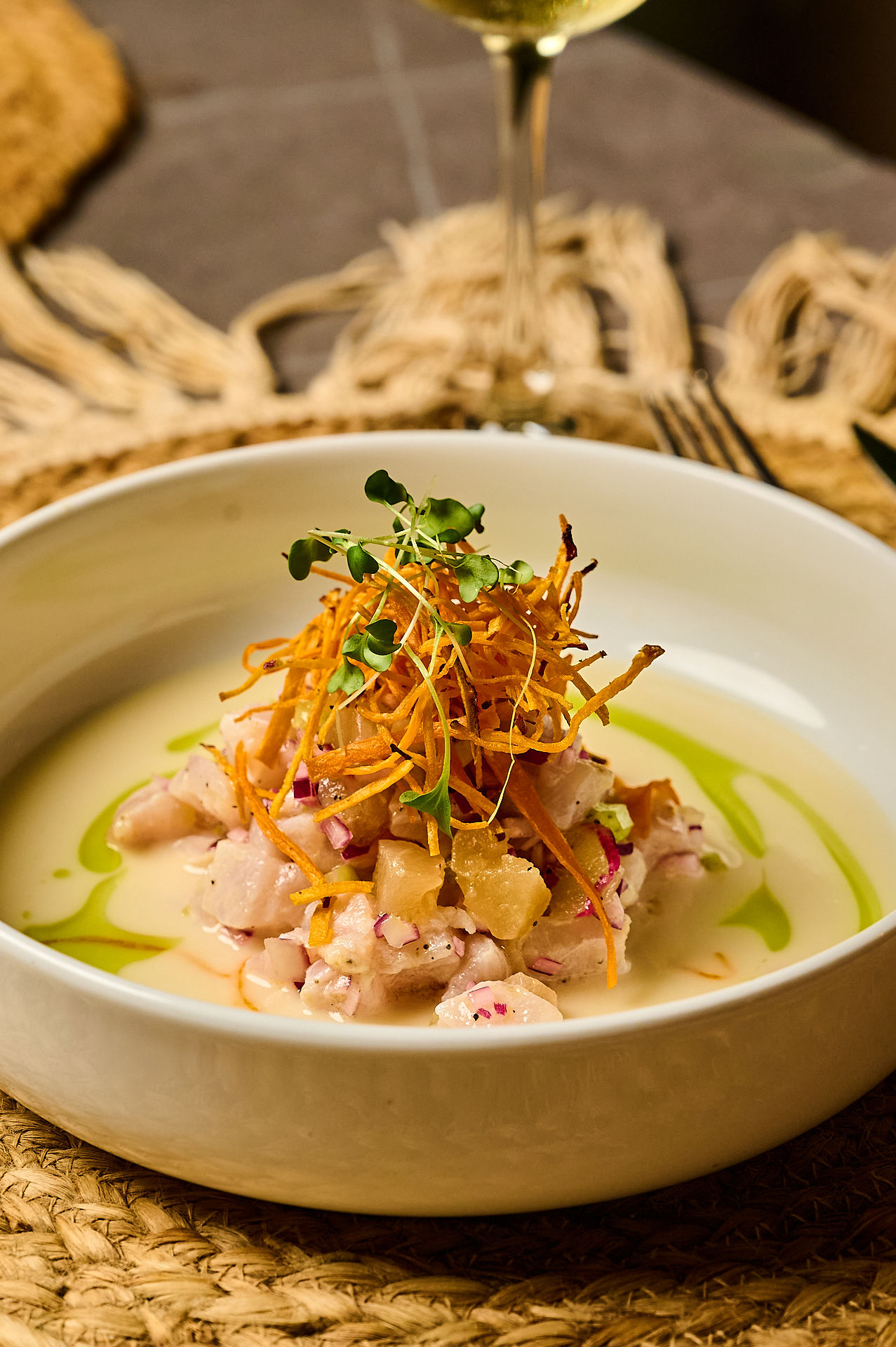 Frescura del Pacífico con leche de tigre de coco y aceite verde.